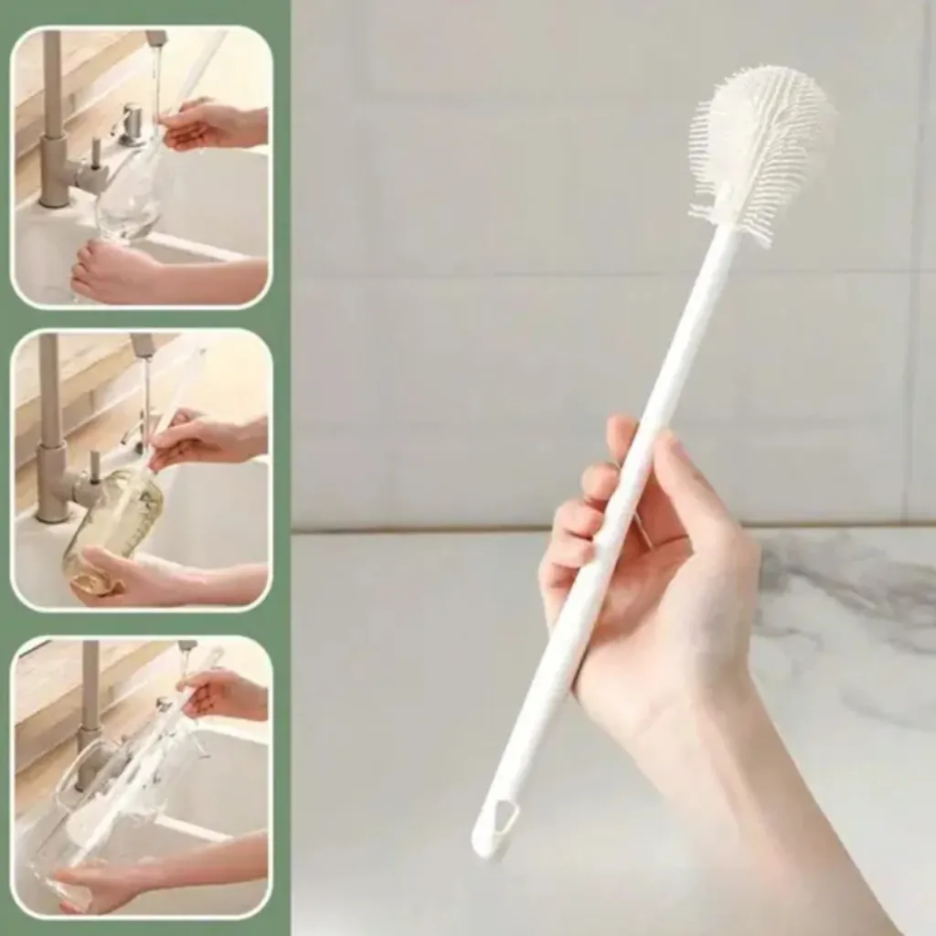 Versatile long-handle silicone brush for deep cleaning bottles, glasses, and mugs. Features flexible bristles for hard-to-reach areas and gentle scrubbing.