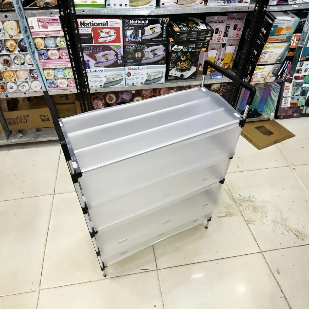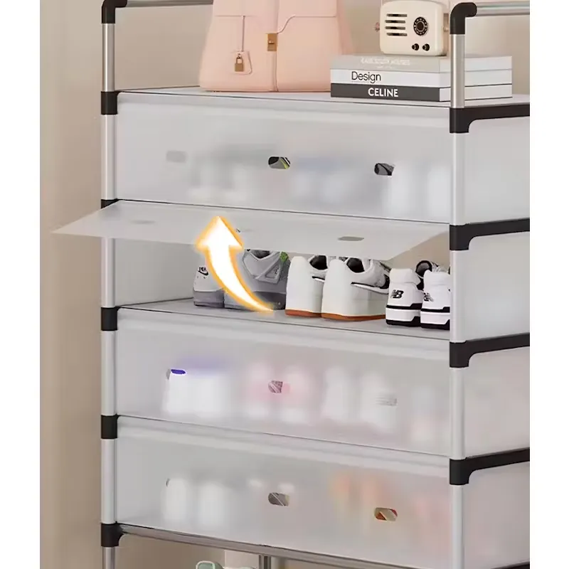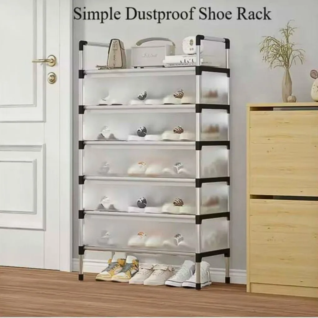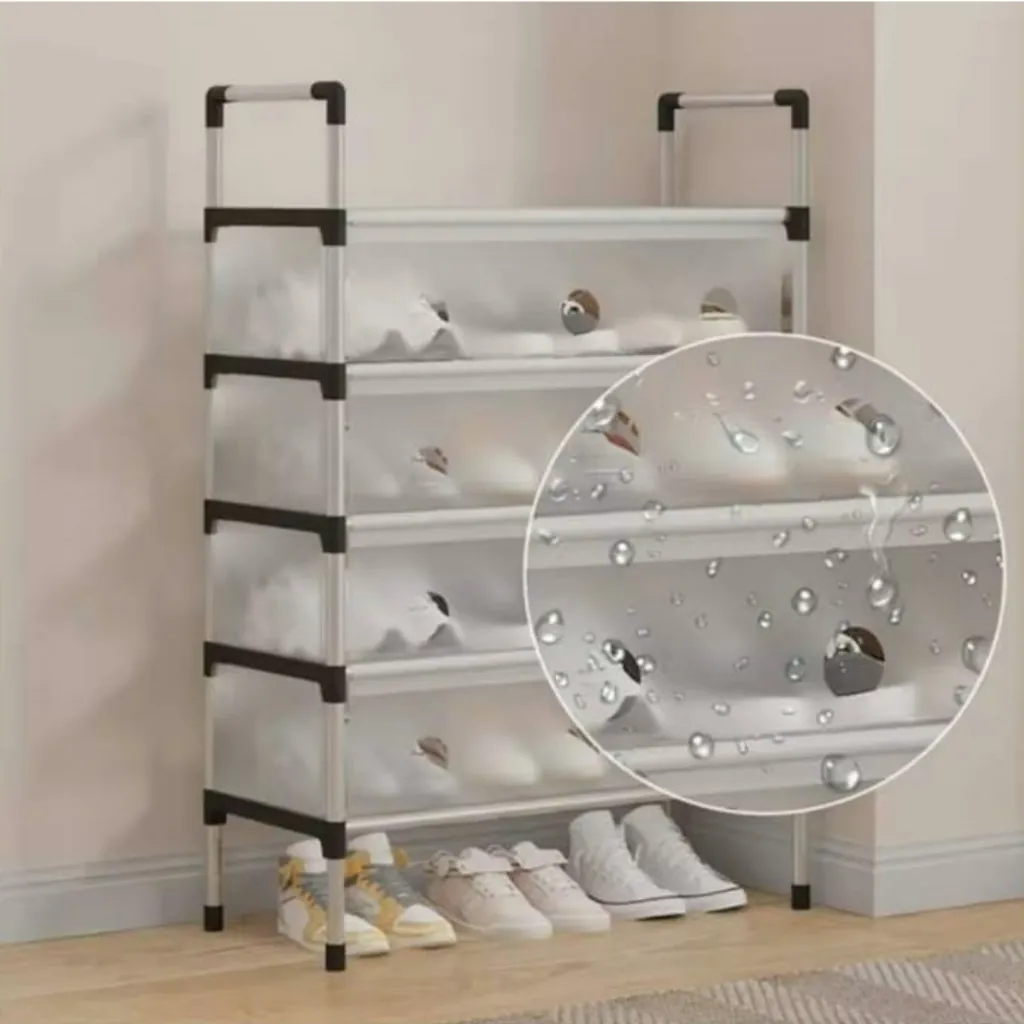 Neatly store your footwear with this 5-layer dustproof shoe rack – easy to assemble, space-saving, and protective.