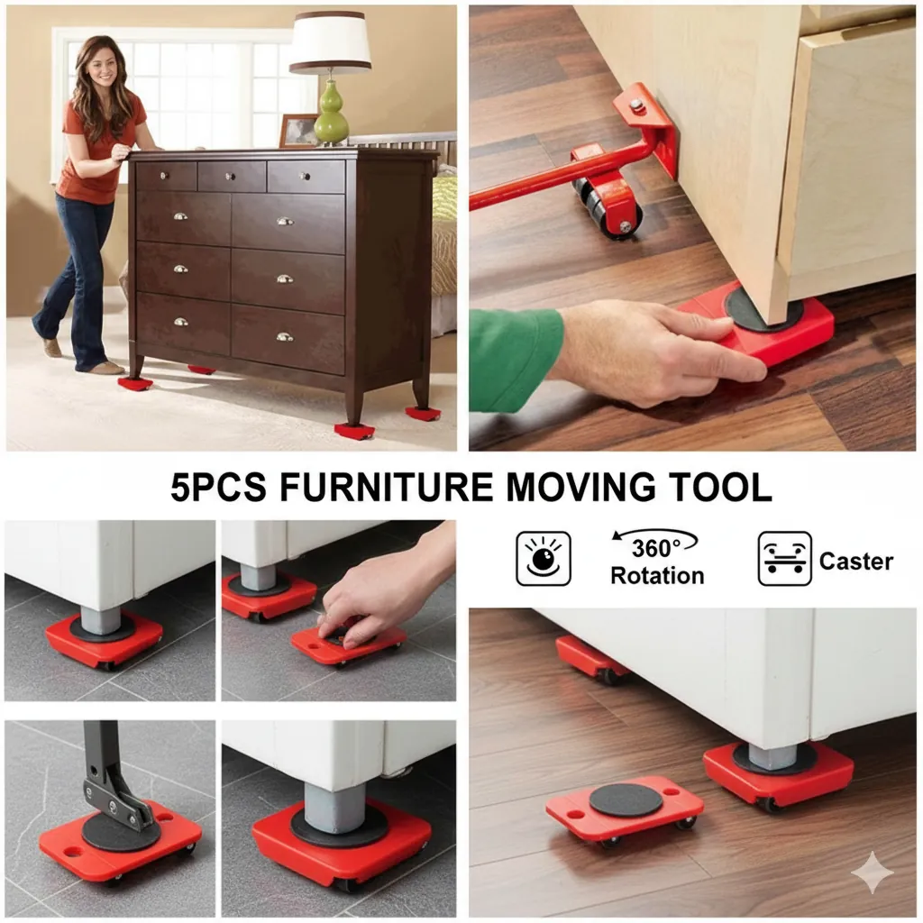 5-piece furniture moving tool set including a lifter and four 360° rotating sliders for easy and safe furniture relocation.
