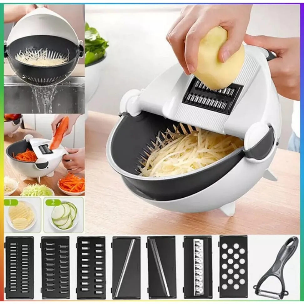Simplify food prep with our 9-in-1 vegetable slicer and drain basket. This versatile kitchen tool includes interchangeable blades for slicing, shredding, grating, and dicing, plus a built-in colander for washing.