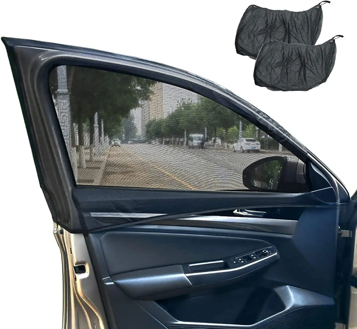 This set of 4 black car window sun shades provides UV protection for front doors. Made from breathable mesh, they reduce glare and heat inside your vehicle while maintaining visibility. Easy to install and remove.