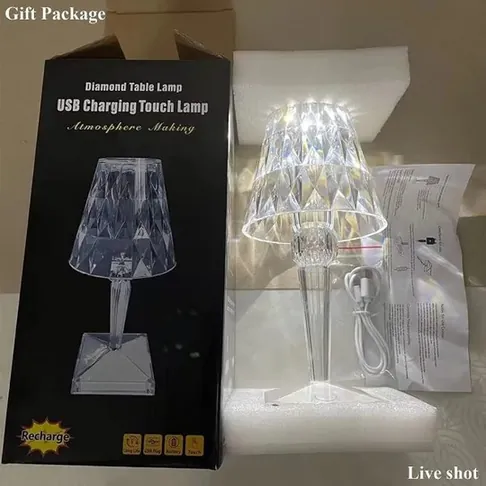 Transform your living space with the elegant and modern Diamond Crystal LED Table Lamp. This stunning USB rechargeable touch lamp is designed to create a captivating ambiance, perfect for bedrooms, living rooms, dining areas, or even as a chic desk accessory.