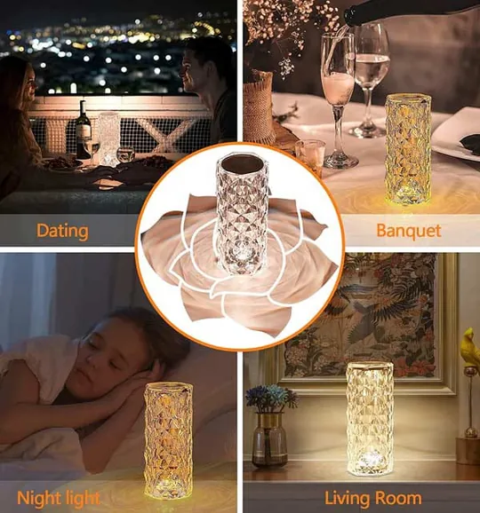 Elegant crystal table lamp with touch control, 16 vibrant RGB colors, adjustable brightness, and remote for ambient lighting.