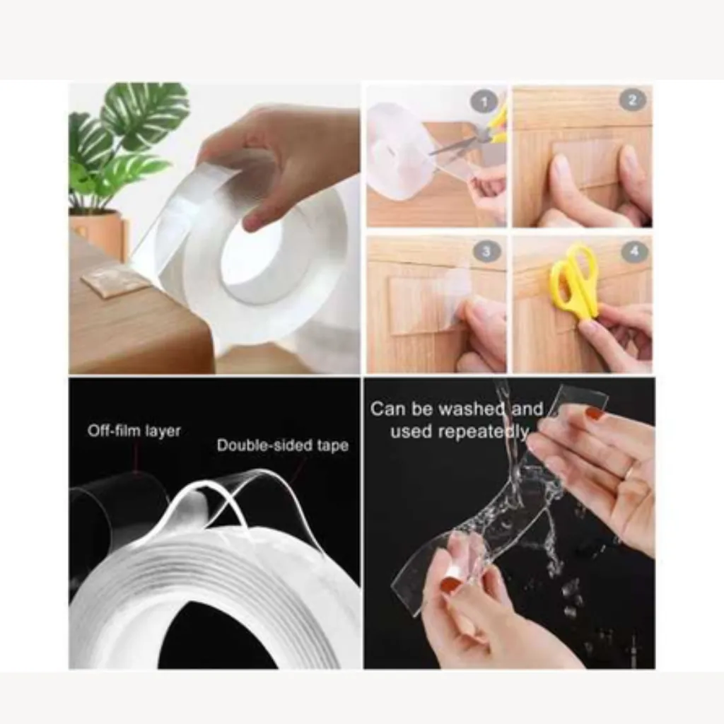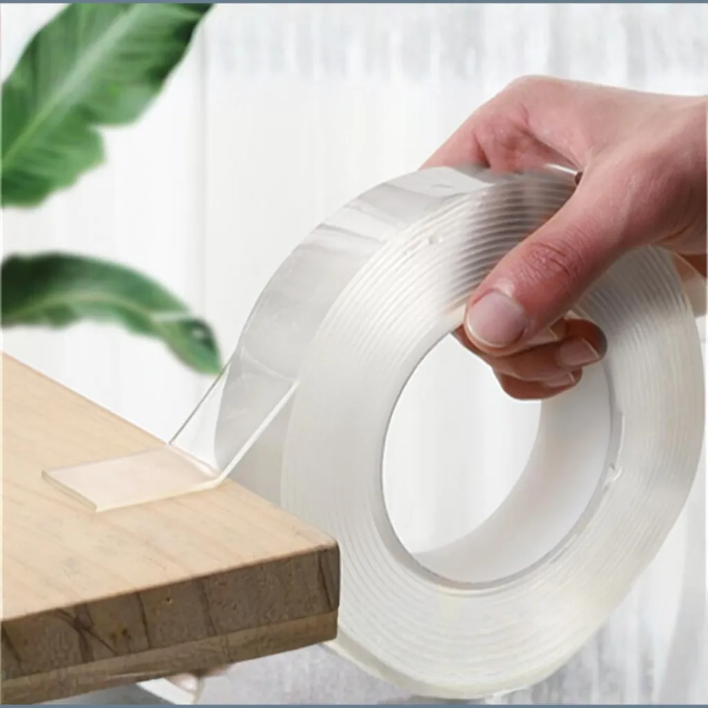 Discover the ultimate sticking power with our heavy-duty, reusable nano tape. This transparent, double-sided adhesive securely mounts items, fixes carpets, organizes wires, and holds kitchenware or toiletries without drilling or damage.