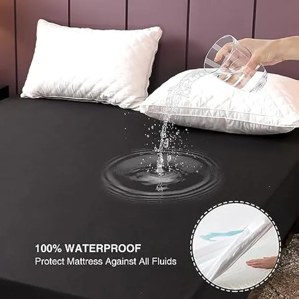 This king-size waterproof fitted mattress protector provides ultimate protection for your mattress against liquids, stains, sweat, and allergens. The waterproof layer ensures that spills don't penetrate, keeping your mattress clean and hygienic. Despite its protective nature, the material is breathable and noiseless, ensuring a comfortable and undisturbed night's sleep. The fully elasticized design provides a snug and secure fit on standard king-sized mattresses, preventing shifting or bunching. Easy to care for and machine washable.