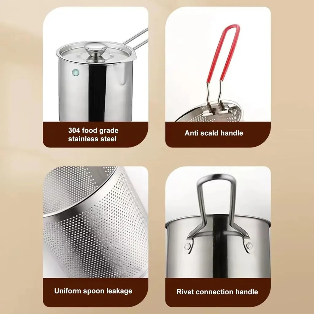 1.2L stainless steel deep fryer pot with strainer basket and heat-resistant handle. Ideal for home frying – durable, easy to clean, and compact.