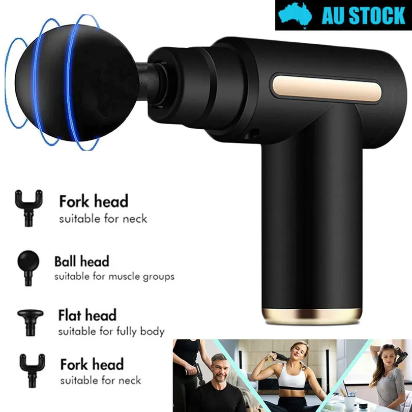 Portable mini massage gun for deep tissue muscle relief. Handheld percussion massager with multiple attachments.