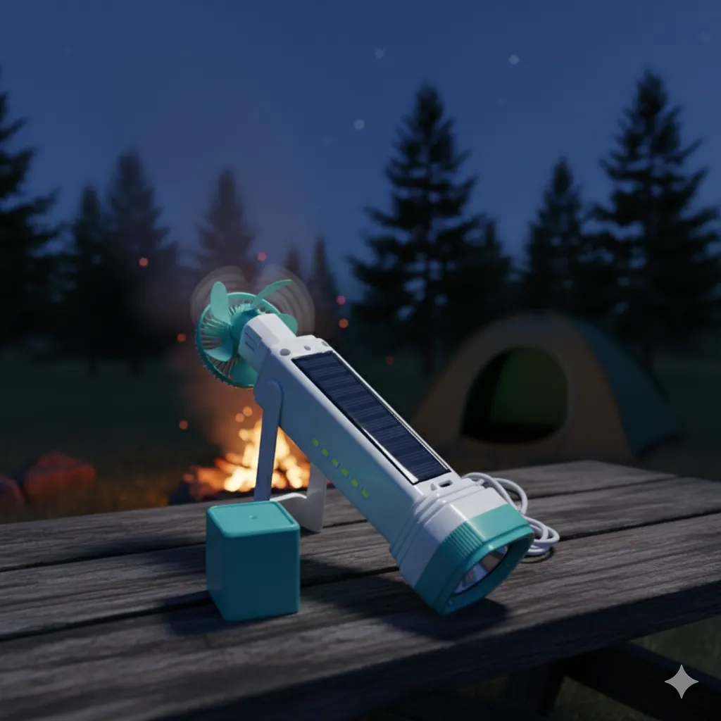 Solar-powered multi-function flashlight with LED, fan, and side lantern. USB rechargeable, ideal for emergencies and outdoors.