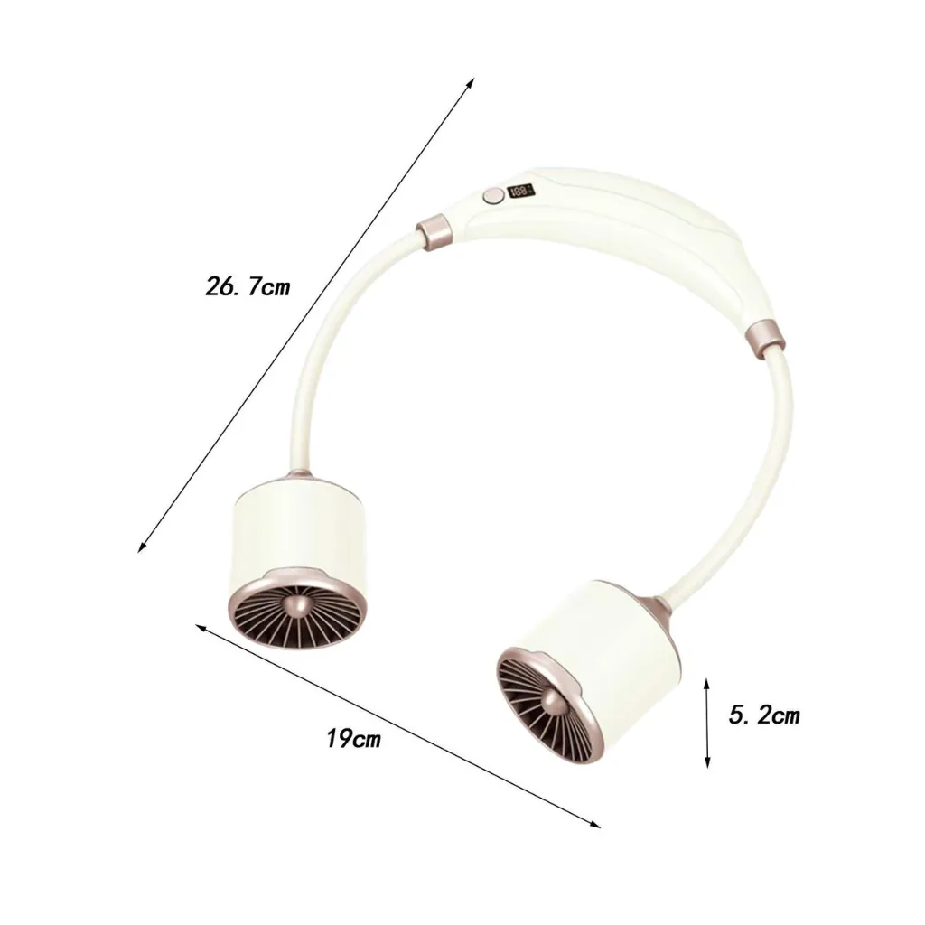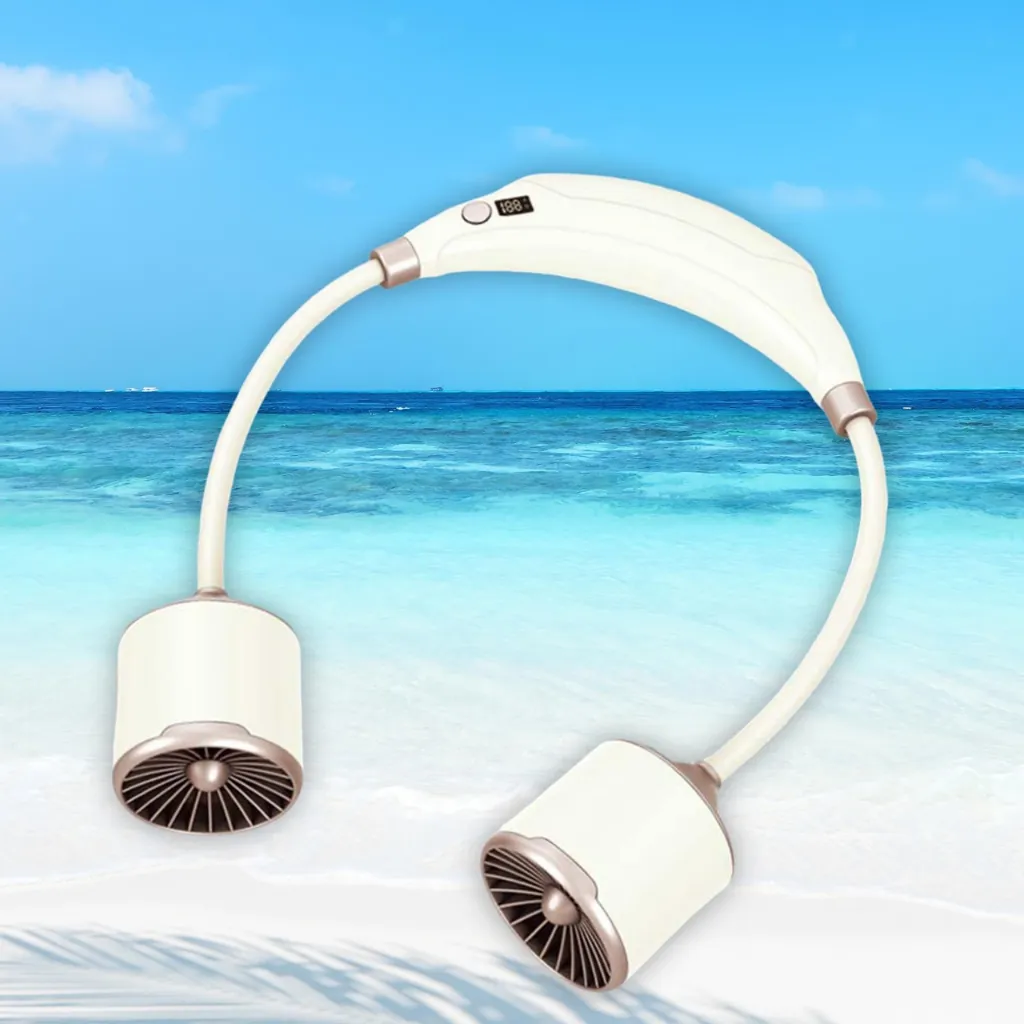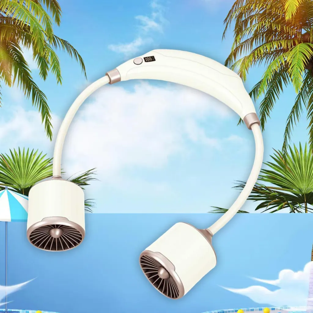 Portable neck fan with digital display for hands-free cooling. Ideal for summer, outdoor activities, and travel. Rechargeable and quiet.