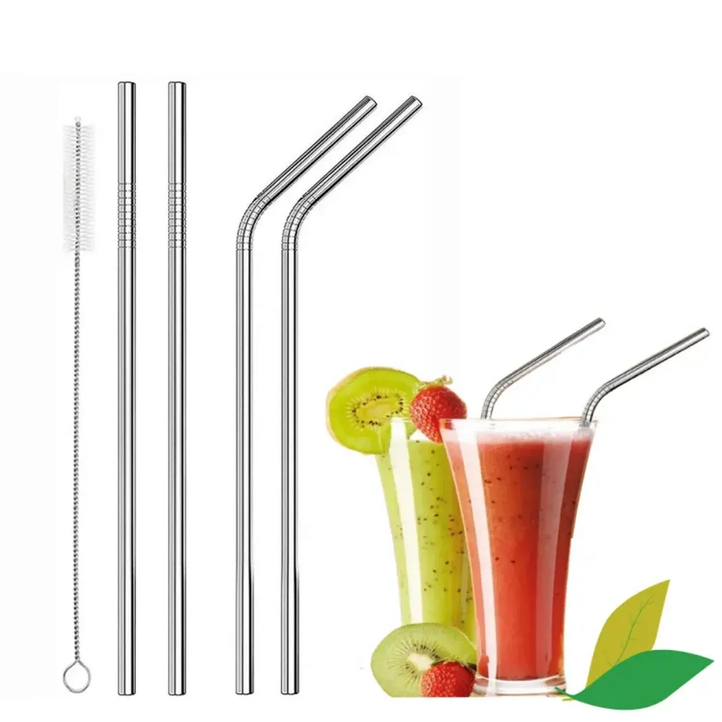 Pack of 5 reusable stainless steel straws with a cleaning brush. Includes 3 straight and 2 bent straws – perfect for smoothies, juices & cold drinks.