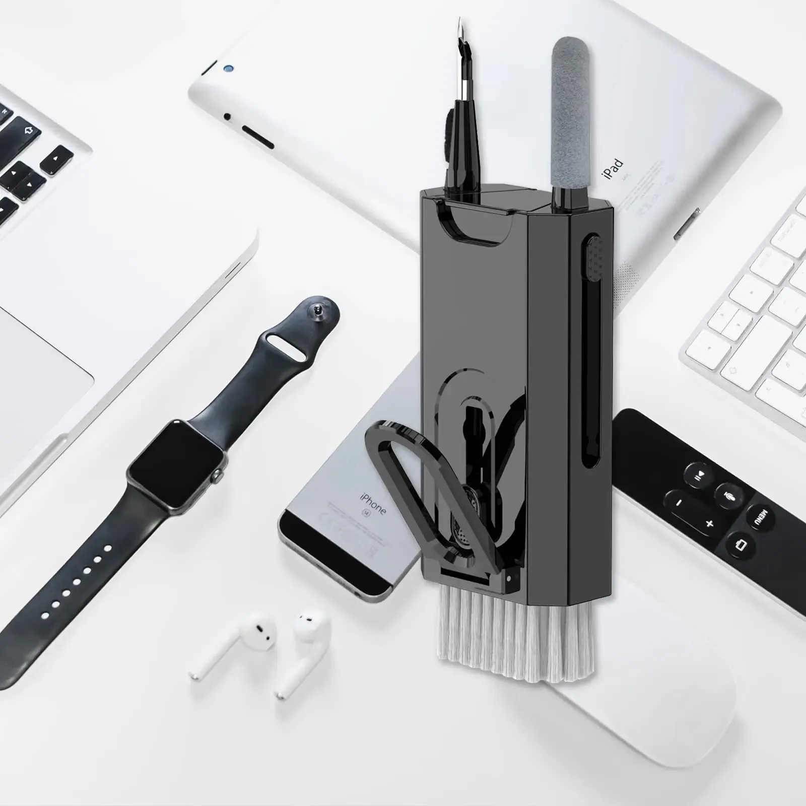 Versatile 8-in-1 cleaning kit for phones, tablets, laptops, and keyboards, featuring spray bottle, cloths, brushes, and more.