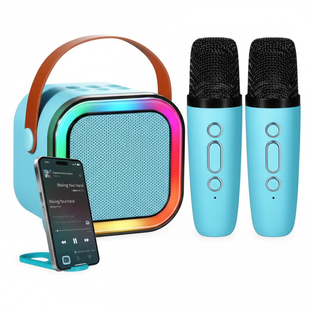 The K12 portable karaoke speaker system is designed for enjoyable singing experiences. This set includes a compact speaker unit and two wireless microphones, allowing for duets and group performances. With Bluetooth connectivity, it easily pairs with smartphones, tablets, and other devices to play your favorite karaoke tracks. The speaker delivers clear and vibrant sound, while the wireless microphones offer freedom of movement. Its portable design makes it easy to take the karaoke fun anywhere. The packaging indicates a "Colorful karaoke sound system."