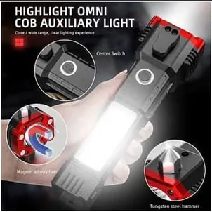 Multifunctional rechargeable LED torch is an indispensable tool for vehicle emergencies. It combines a bright LED flashlight with a power bank to charge your devices. For safety, it features a sharp window hammer to break glass and a seatbelt cutter to free yourself quickly. The torch also offers different illumination modes for various situations. Compact and durable, it's a vital addition to any car emergency kit, providing peace of mind on the road.