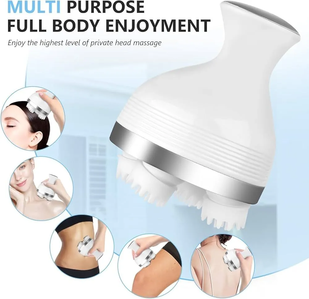 Cordless electric scalp massager with 4 massage heads. Promotes hair growth, improves blood circulation & reduces stress. Rechargeable & waterproof.