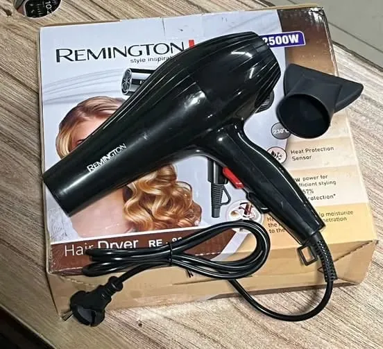 Powerful 3500W Remington hair dryer (RE-8800) for fast drying and styling. Includes concentrator and diffuser.