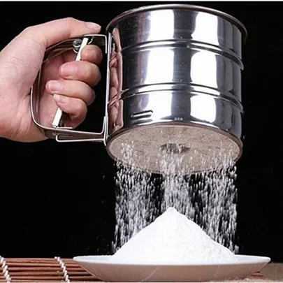 Handheld stainless steel flour sifter with an easy-to-squeeze handle for effortless sifting of flour, powdered sugar, cocoa, and other dry ingredients. Ensures smooth and lump-free results for baking.