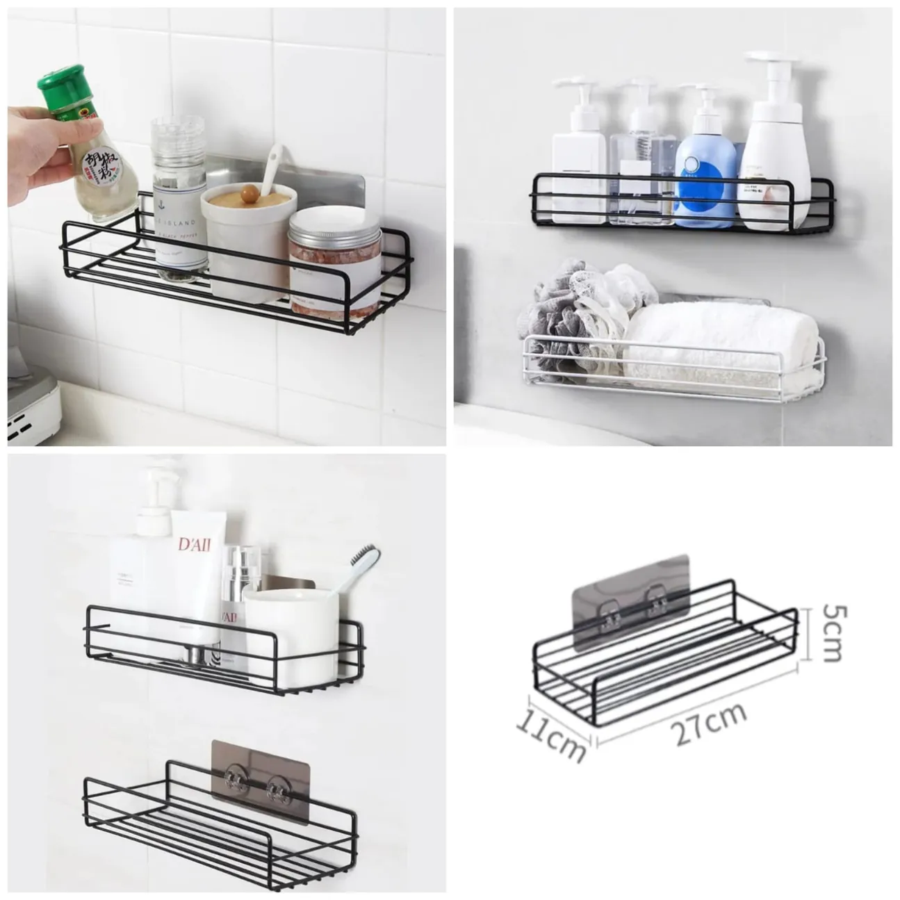 A sturdy iron shelf that sticks to the wall without drilling. Ideal for organizing bathroom or kitchen items like toiletries or spices. Keeps small spaces neat with a stylish design and easy setup.