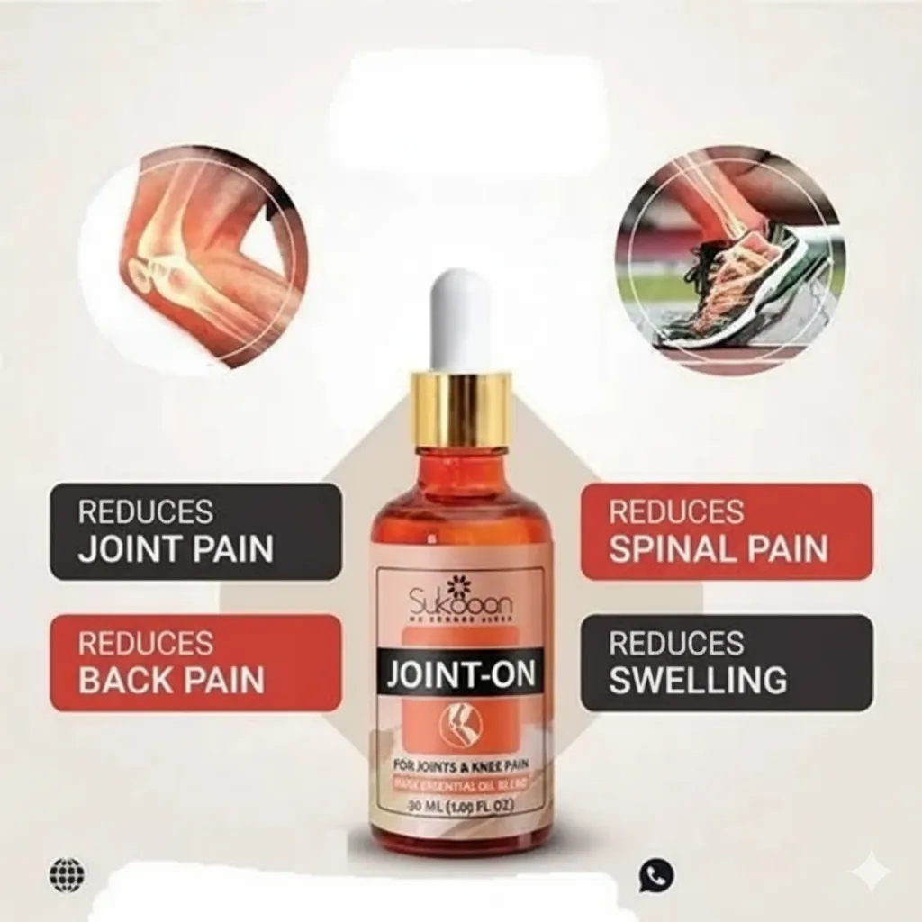 Sukoon Joint-On is a powerful blend of natural essential oils designed for fast, effective relief from joint, knee, back, and spinal pain. It helps reduce stiffness and swelling naturally.