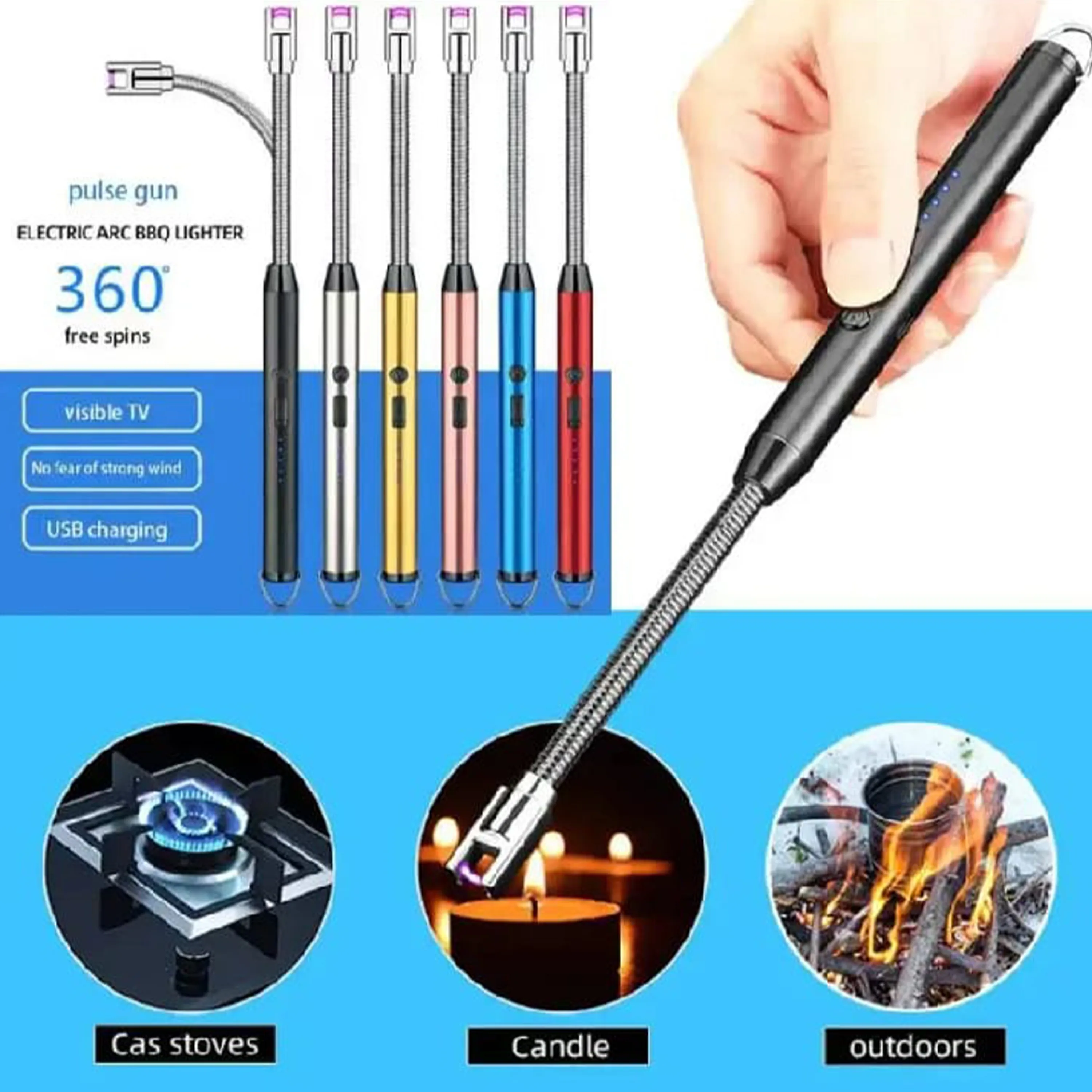 This versatile electric arc lighter features a 360° rotating neck and visual power display. It's windproof, USB rechargeable, and perfect for lighting BBQs, candles, stoves, and more. Its long, flexible design ensures safe and easy ignition in various situations, making it a handy kitchen and outdoor tool.