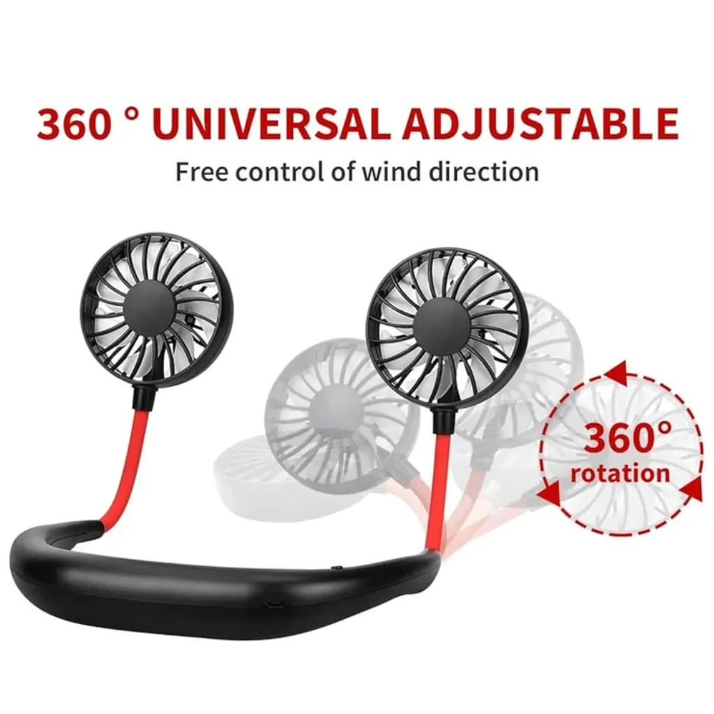 Portable USB rechargeable wearable neck fan. Hands-free personal cooling for sports, travel, and outdoor use
